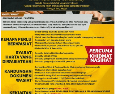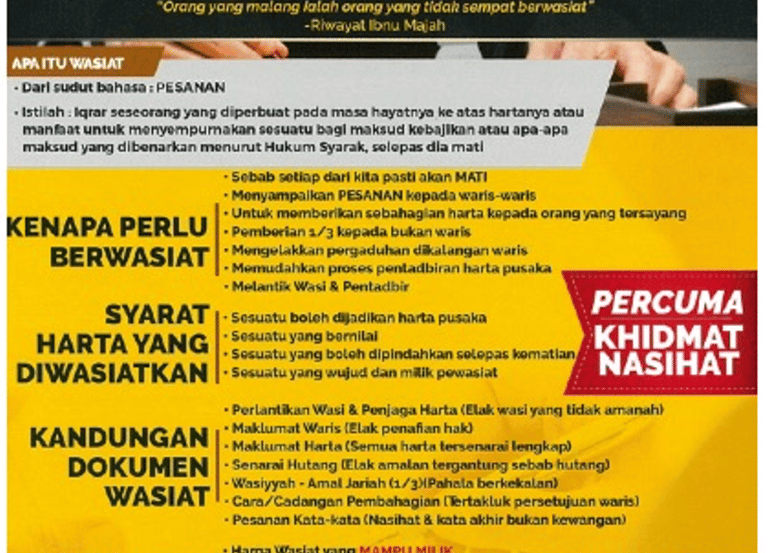 Perkhidmatan rundingan untuk merancang pewasiatan anda dengan bijak. Kami adalah Rakan Niaga MyAngkasa Amanah Berhad (MAAB) dan sedia memberi nasihat berkaitan pewasiatan, hibah dan seumpamanya yang berkaitan dengan pengurusan harta selepas kematian. Dokumen wasiat untuk warganegara yang bukan beragama Islam juga disediakan